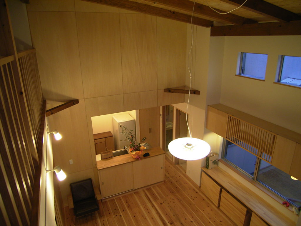 - 部屋部分だけで吹き抜けをとるのは、もったいないので吹き抜けの中に階段を入れる。