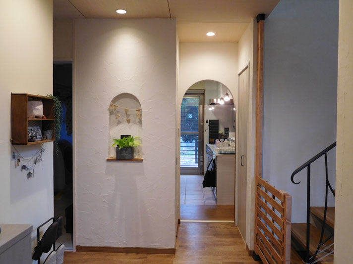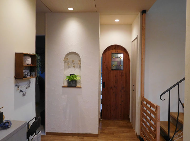 奥様は、玄関にはRのニッチスペースが欲しいと思っているが、目線が扉に向いてニッチが目立たなく見えるのは嬉しくない。 玄関からキッチンへの一直線の短動線を楽しみたいと思っている。