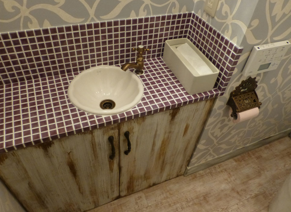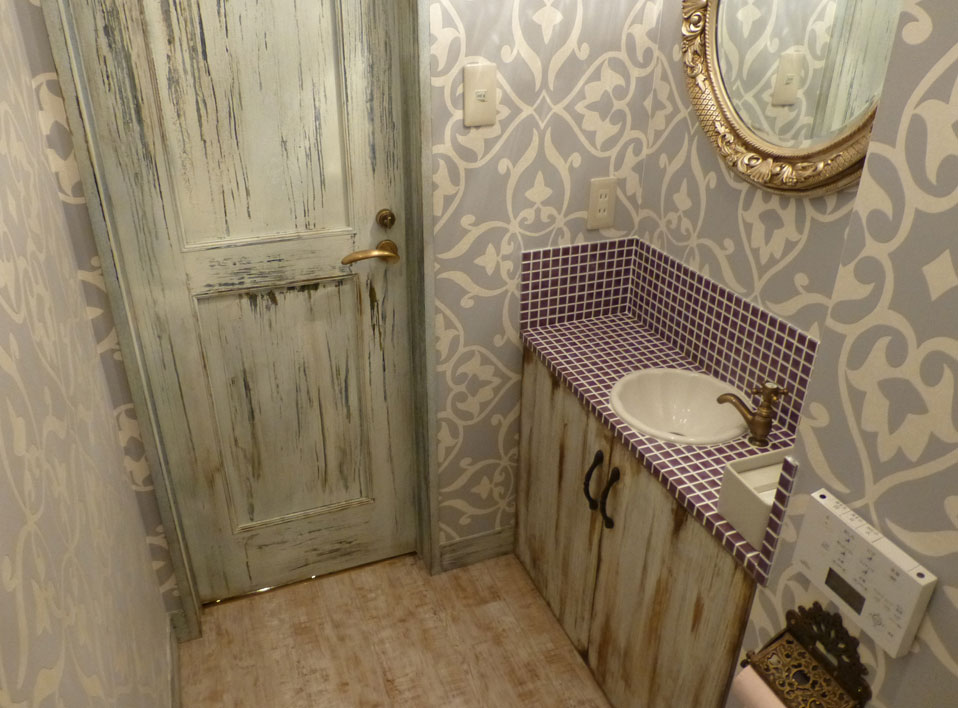 - ボウルやカラン、ペーパーホルダーだけでもアンティーク風にできるが、エイジング塗装を最大限に活かしたデザインで、こだわり感のある空間が出来た。