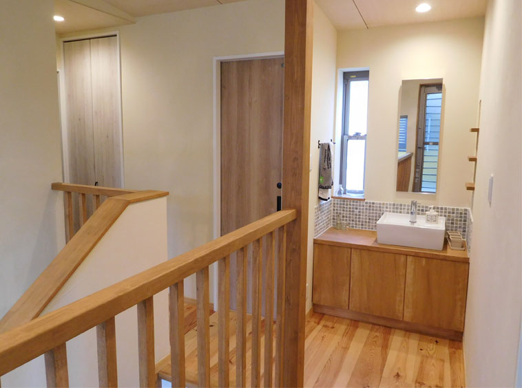 2階に寝室があるので、廊下の途中に洗面化粧台があれば、使い勝手上便利だろう。間仕切らない洗面を作ることで、敢えて魅せる洗面化粧台をつくろう。