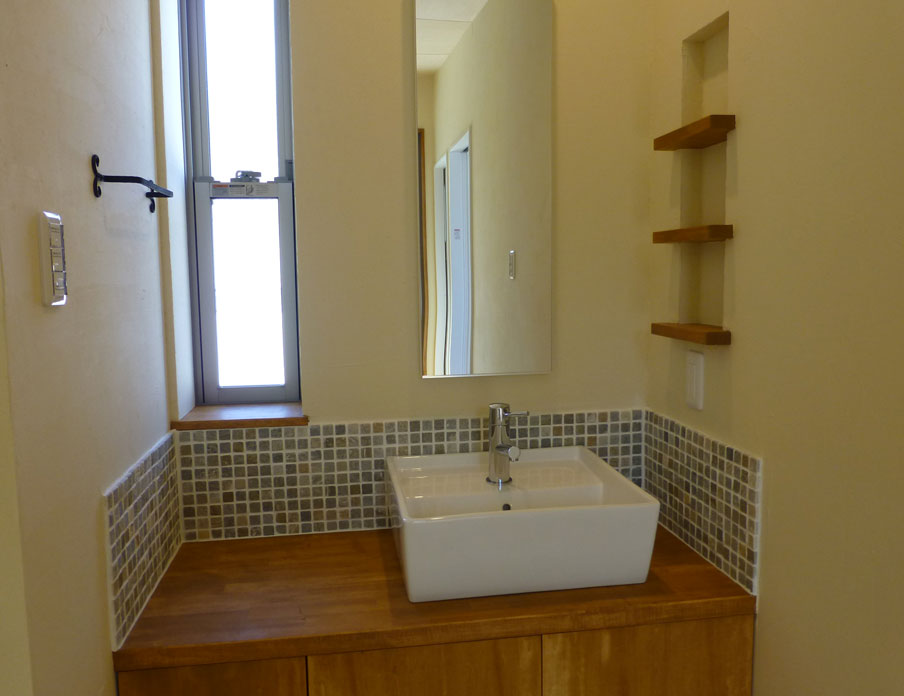 - 置き型の洗面台とモザイクタイルで、家族のテイストにあう仕上げを施す。